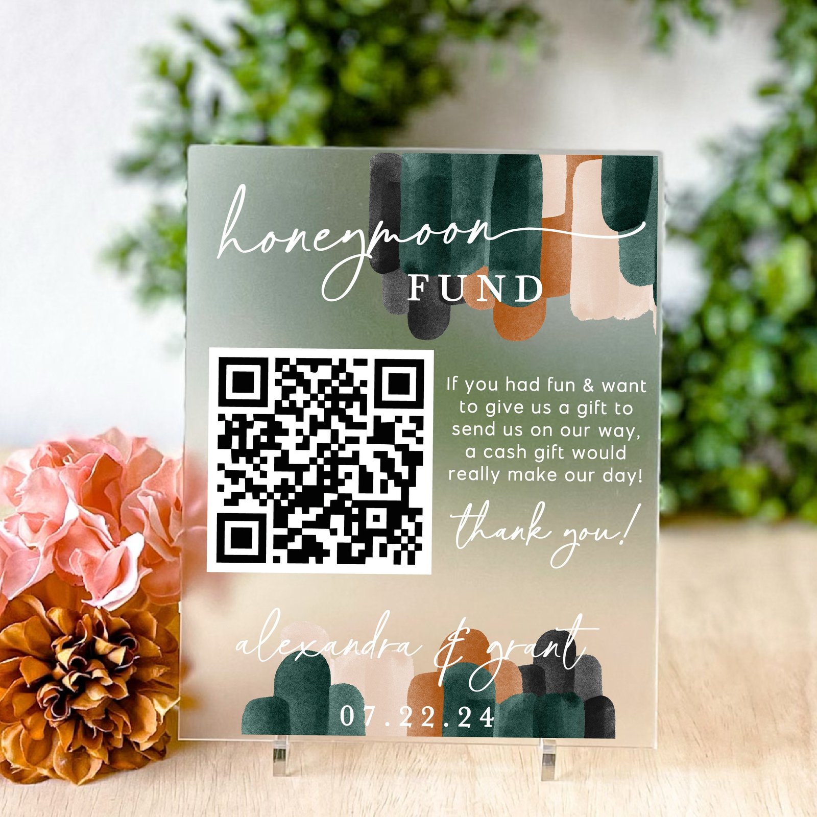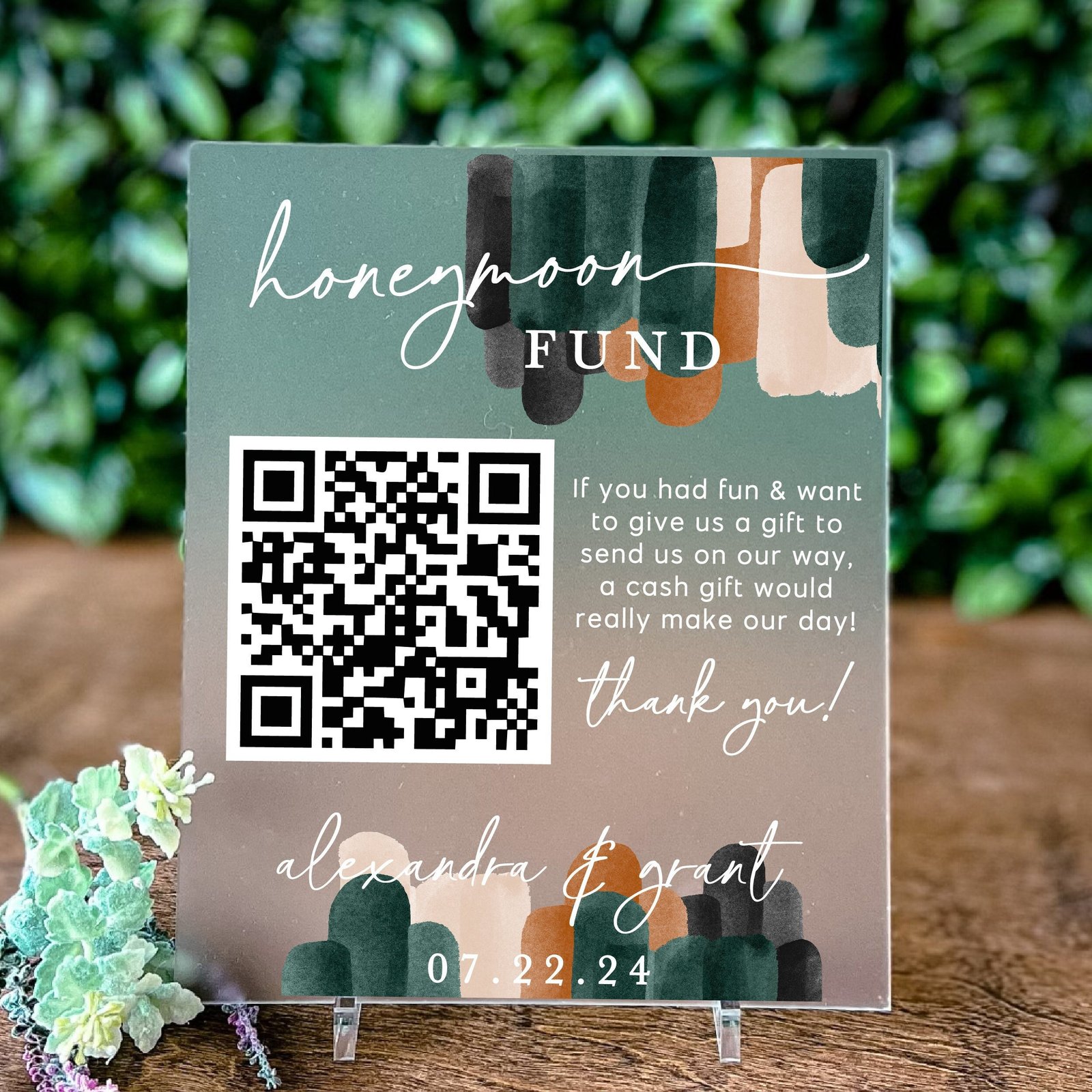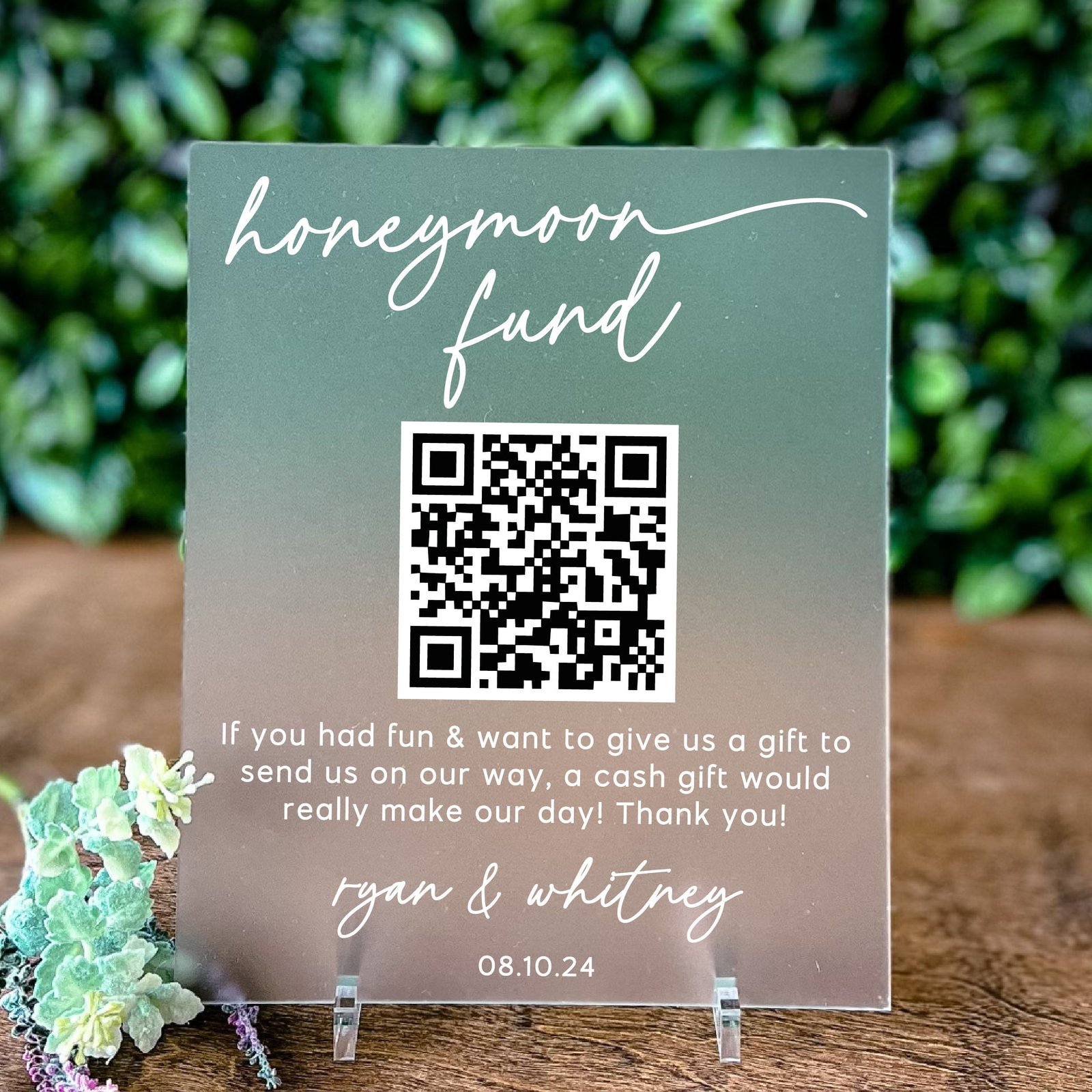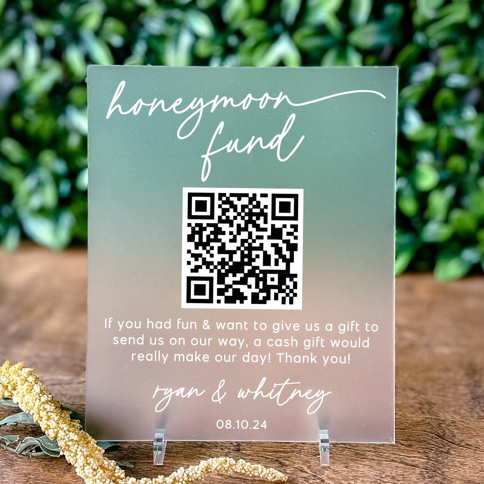 - Custom QR Code: Personalize your sign with a QR code linked to your preferred honeymoon fund platform for easy contributions.