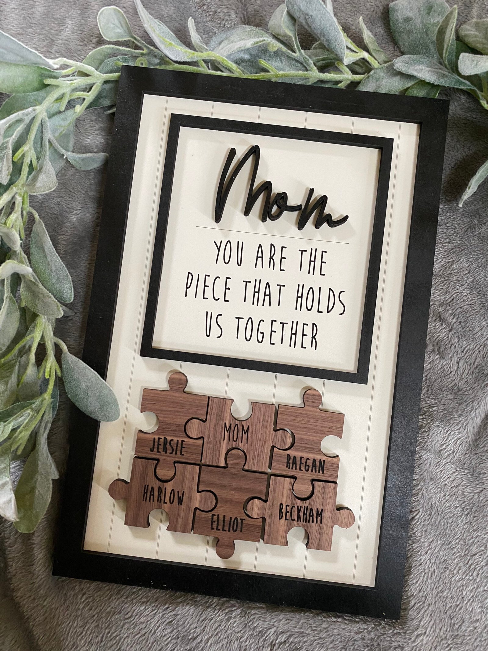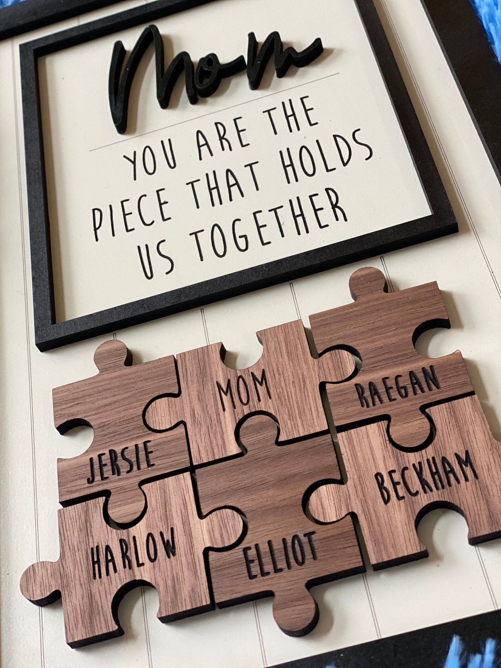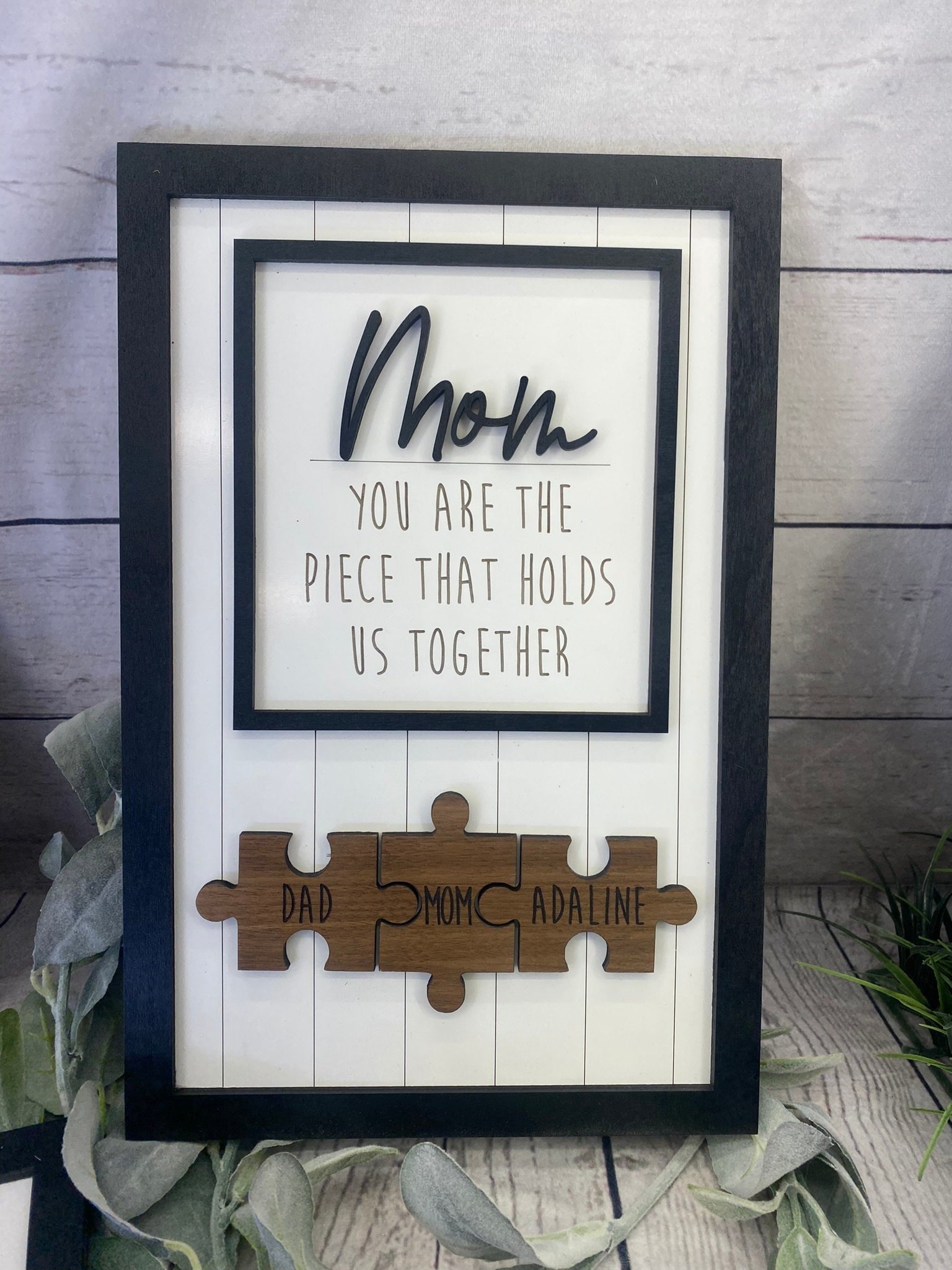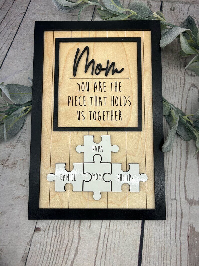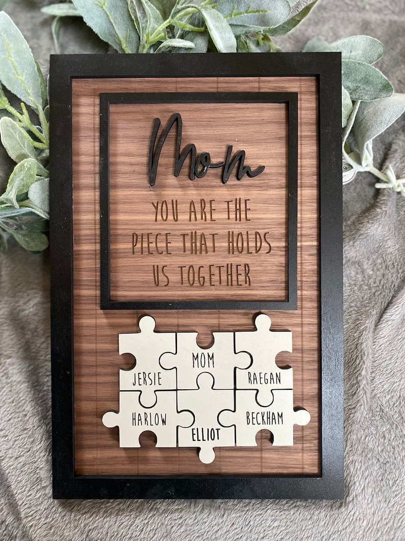 Every piece tells a story—honor Mom with a personalized wooden puzzle sign that shows how perfectly you all fit together.