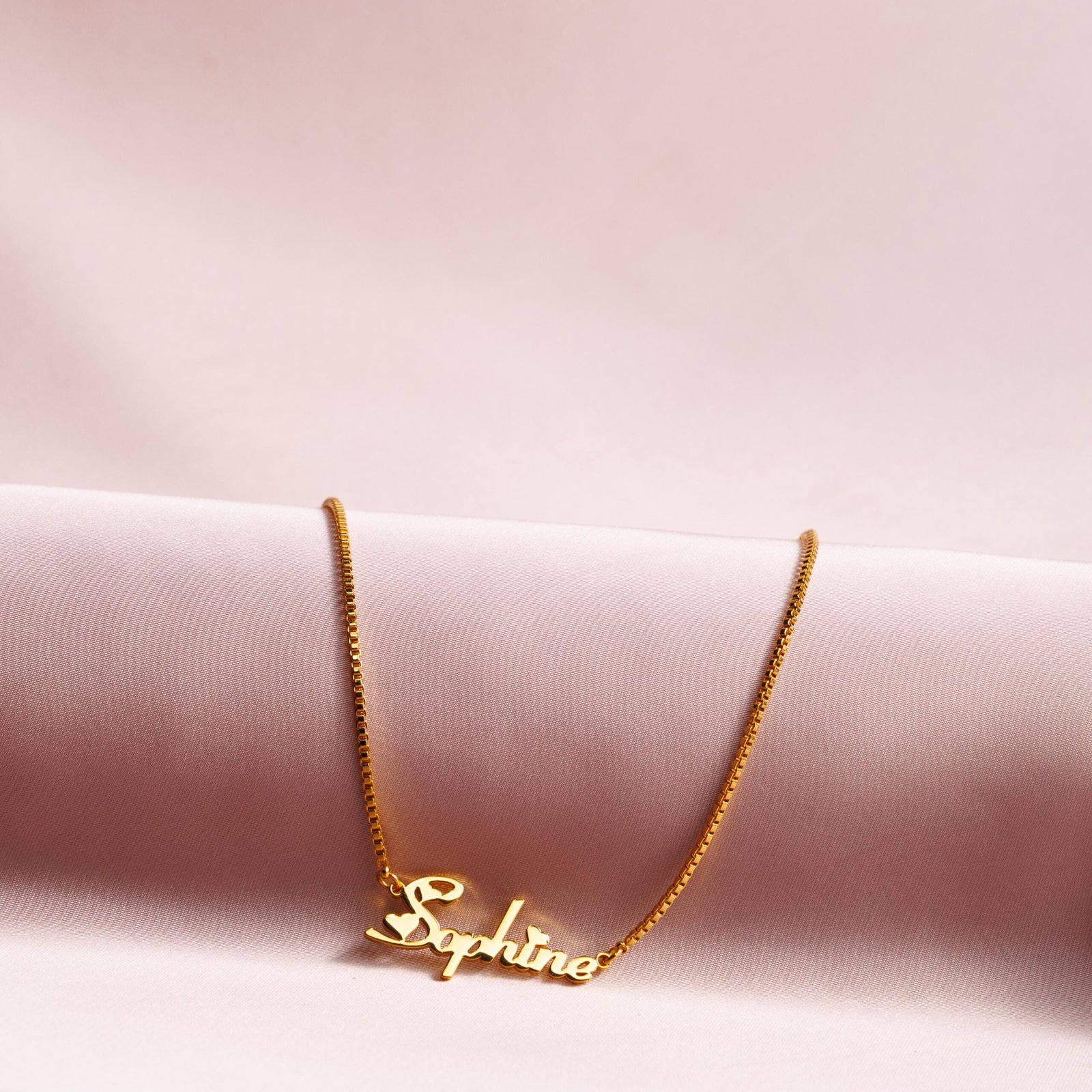 Our Personalised Name Necklace with Heart is more than just jewellery—it’s a piece of your story. Crafted from high-quality brass and available in luxurious 14k gold plating, this dainty necklace features a custom name or word paired with a small heart charm, symbolising love, care, and connection. It’s a timeless piece for women, kids, and anyone who wants to carry a meaningful name or word close to their heart.