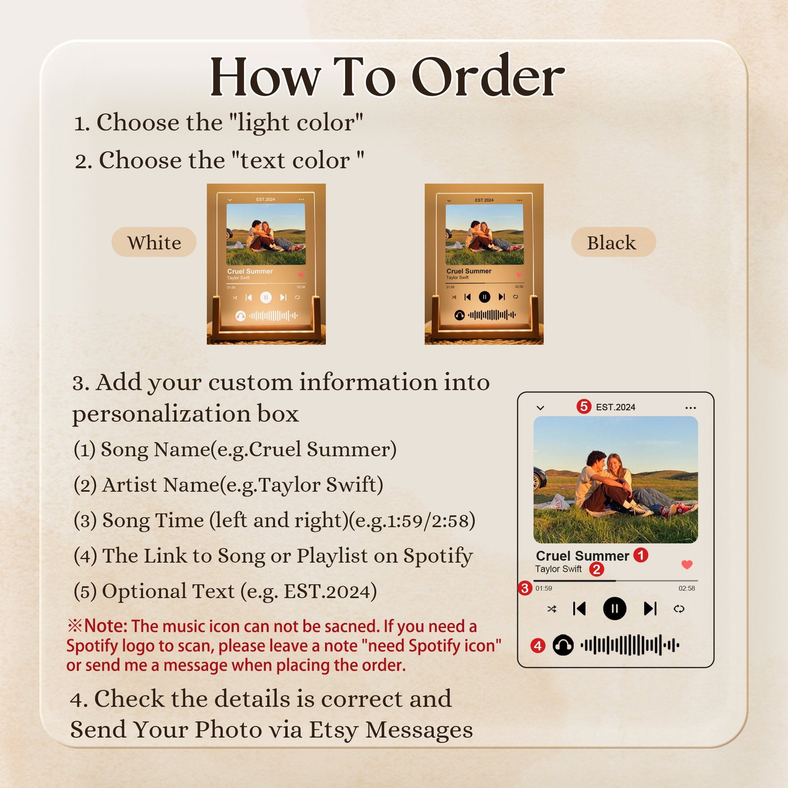 - 🎵 Personalized Song Details Choose your favorite track—add the song name and artist or even a scannable Spotify code. The music element makes it an extra special keepsake for couples, friends, or anyone tied together by a meaningful melody.